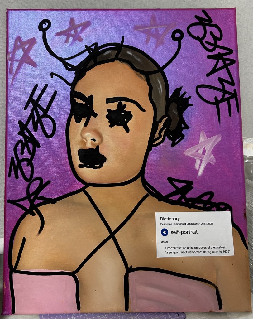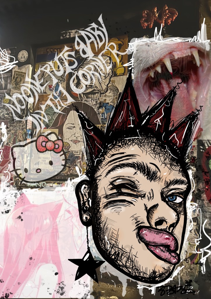 I think my art style is a direct resemblance of myself – I’ve often related to feeling like a spectator in my own body and my work is a reflection of that. My style incorporates quiet alternative dark themes juxtaposed by my love of bold bright colours. I grew up listening to the alternative rap community, artists like lil peep and xxxtentacion helped paved the way and inspire my style.