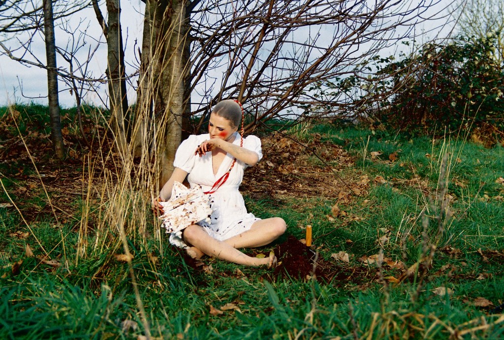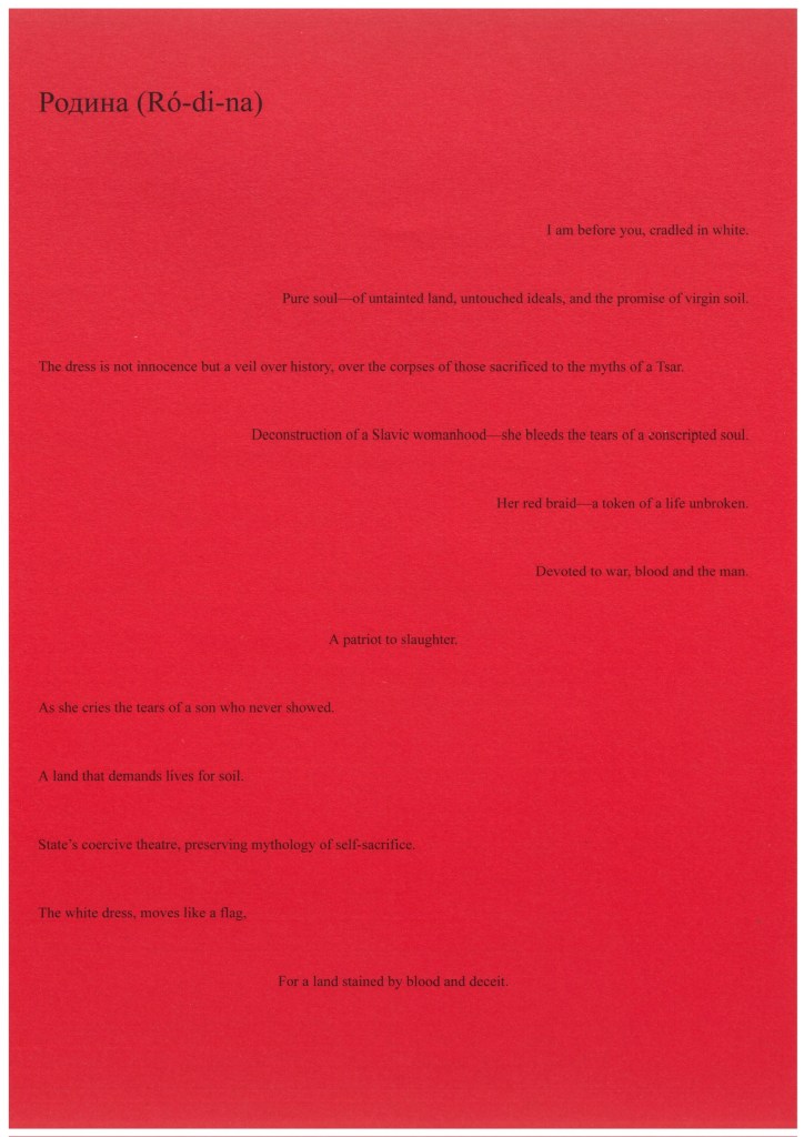 ‘Dressed in a deconstructed embodiment of the Slavic motherland—a fragmented interpretation of traditional “womanly” attire—I became a vessel. The performance began with an act of raw confrontation: consuming soil, a symbol of land, history and atrocities that come with it.‘