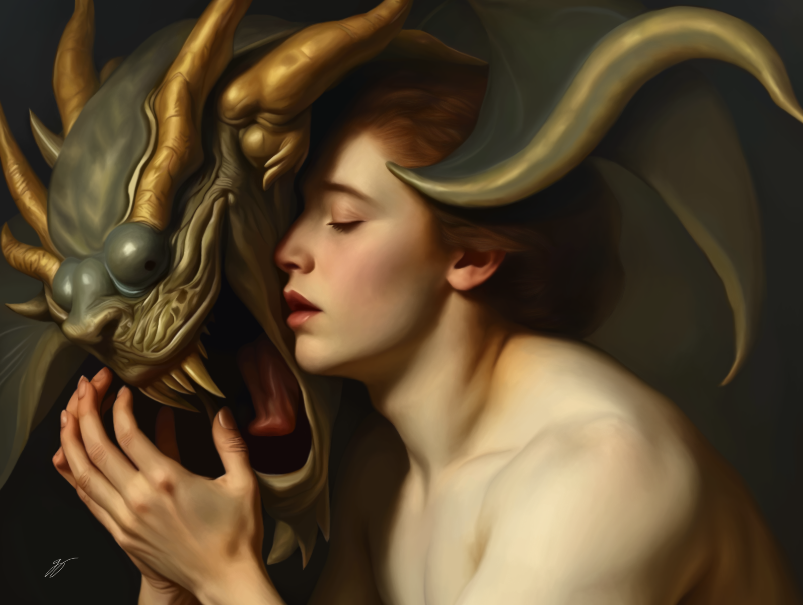 – There’s a recurring theme of a lady and a sharp-toothed beast in your work, why is that?