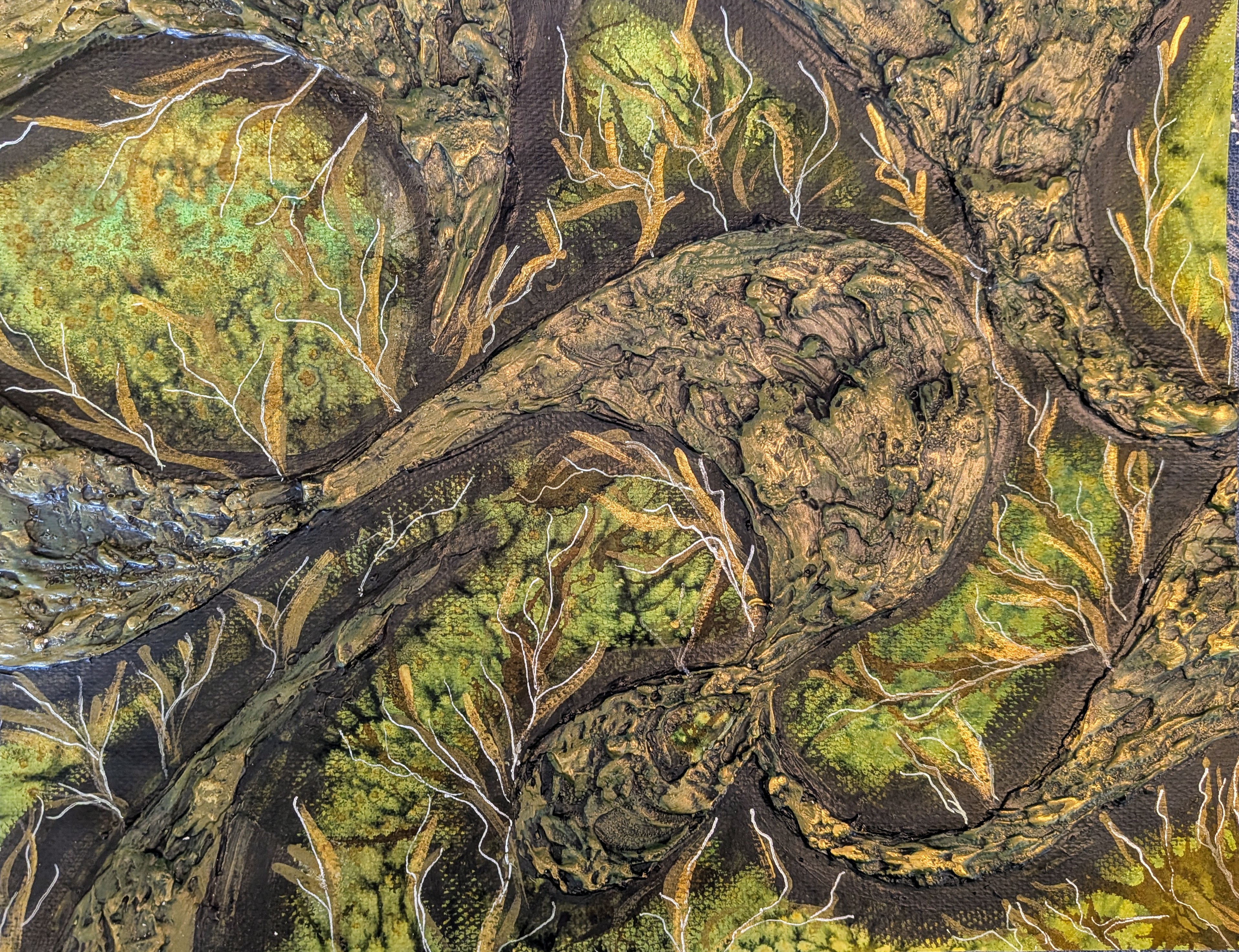 That comparison actually made me laugh, because when I created Where the Battle Broke Open, I wasn’t thinking of paisley at all. I was thinking of lightning. I made it after getting news that my car needed a new engine, something completely out of reach financially at the time. I felt the weight of everything crashing down and turned to prayer, and from that heaviness came this work. It wasn’t planned, just grief, texture, and movement pouring out. The lines remind me of roots, or veins, or prayers pushing through dry earth. Messy, layered, a little wild, but it helped me breathe again. Sometimes what looks like a crack or a tear in your life is actually an opening. A holy space. That’s what this painting became for me.