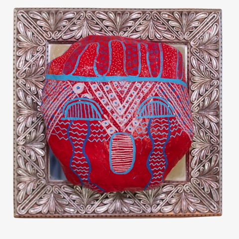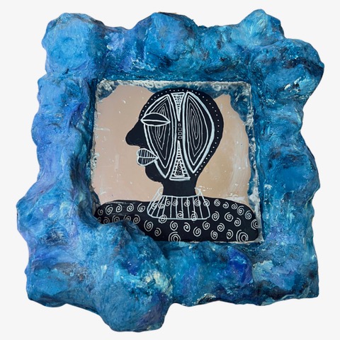One thing I often find myself doing is continuing to evolve a piece until it is out of my hands. I have a piece, “Wura,” that is going to be featured at an upcoming exhibition and it’s a really good example of this. It’s an African mask-inspired piece made from plaster, spray paint, marker, synthetic braiding hair and hair embellishments on a second-hand mirror. It went through about three iterations before becoming its final form. It started as just the mask on the mirror, then I added the hair, then the embellishments, and finally ended up changing the hairstyle. I’m pleased with the final version, but if it was still in my possession, there’s no guarantee that I wouldn’t change it again.
