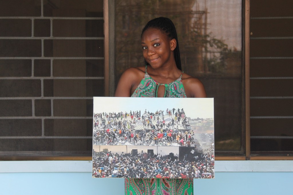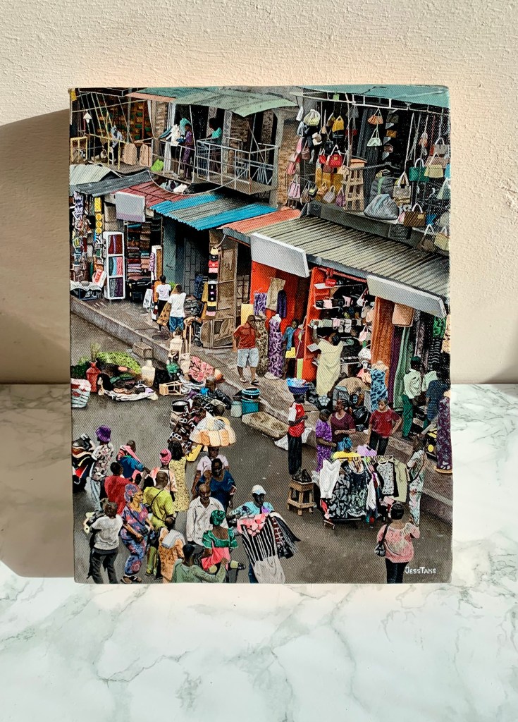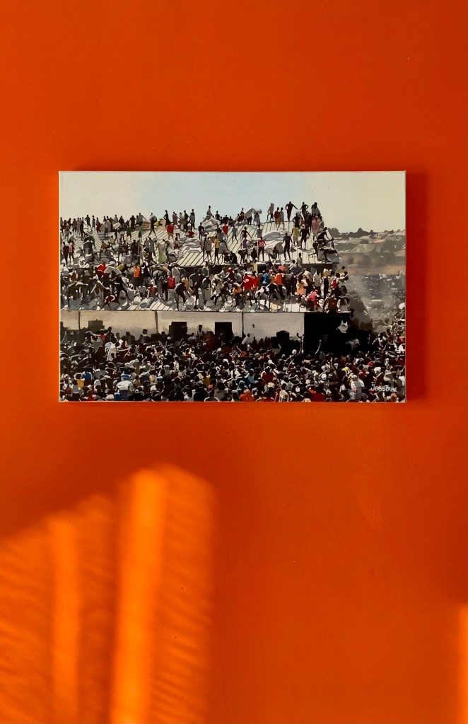 Crowd in Jos is a political piece, and was inspired by a video taken during the pandemic, showing a crowd reclaiming embezzled palliatives in Nigeria. I had bought my first large canvas at the time I watched the video, and instantly knew I had to use it to make that event more than just a video that becomes lost to time. The painting serves as evidence of the decay in human compassion in Nigeria, and symbolically the world at large. I never imagined it would take me take 8 months to complete, but being able to see the improvements to my painting skills over the 8 months on a single canvas, and knowing I was creating an evidence of sort had me curious and excited till the very end.