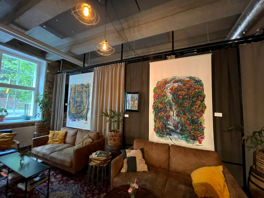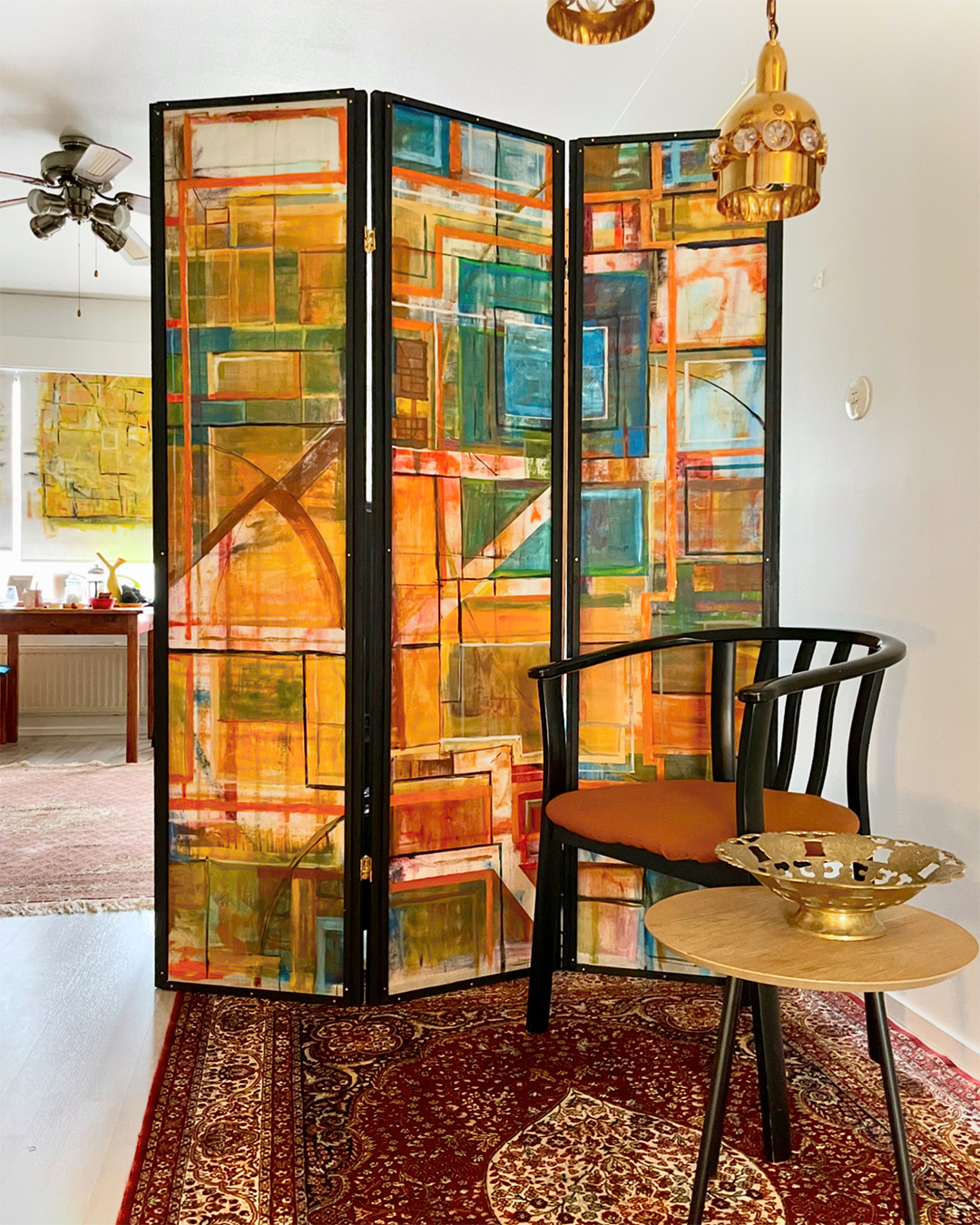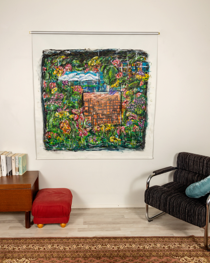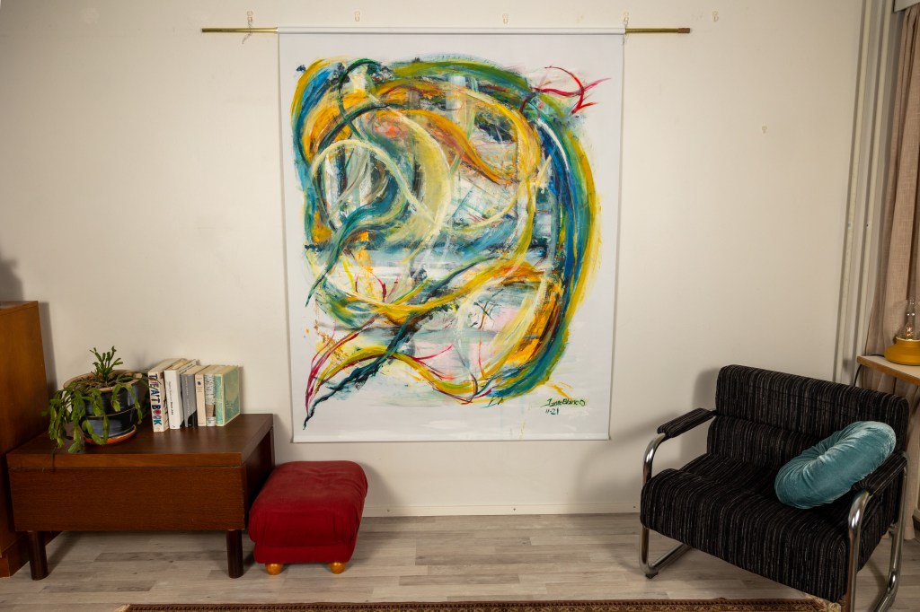 I wanted to paint something huge. I asked if my dad had some old canvases or something. He gave me an old roller-blind to create canvases, but I decided to use the whole roller-blind for one artwork. After finishing that artwork, my girlfriend asked if that works as a roller-blind and artwork same time. We decided to try, and I noticed that a painted roller-blind works as a regular roller-blind and it had potential.