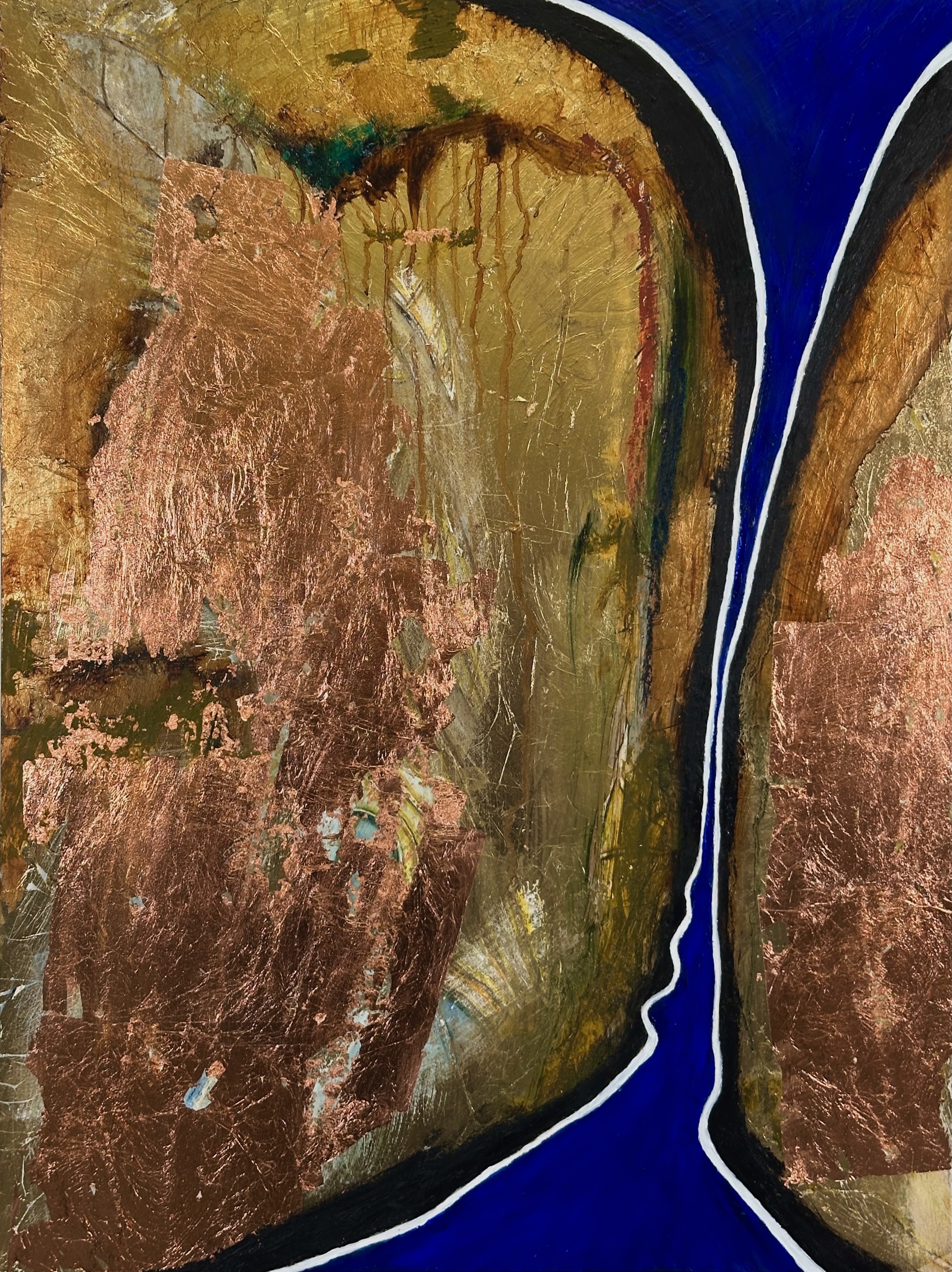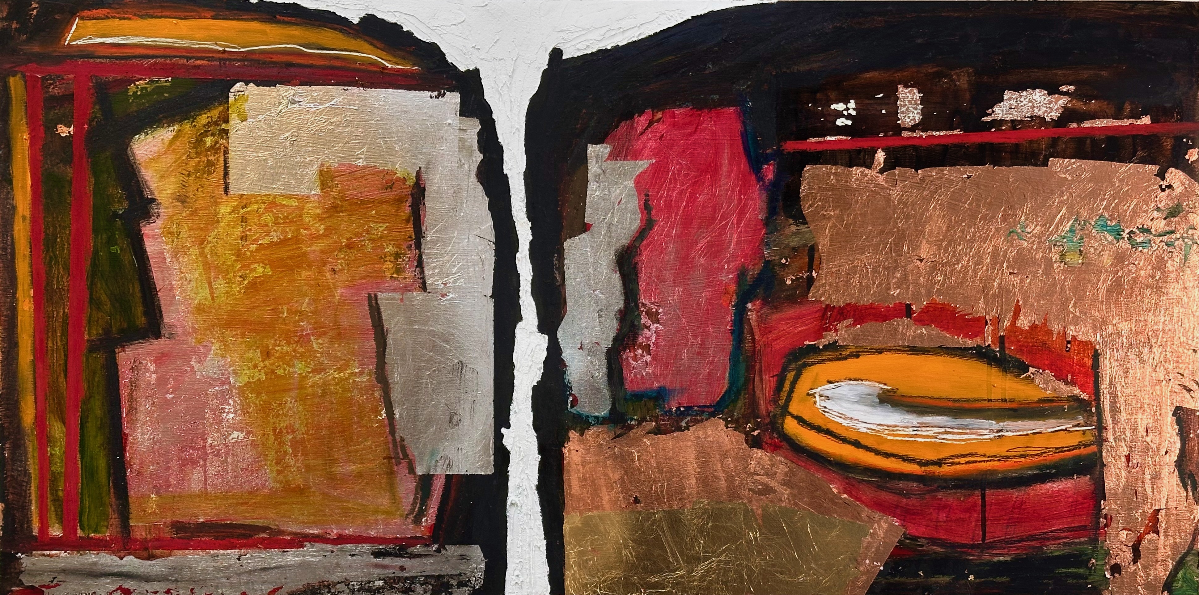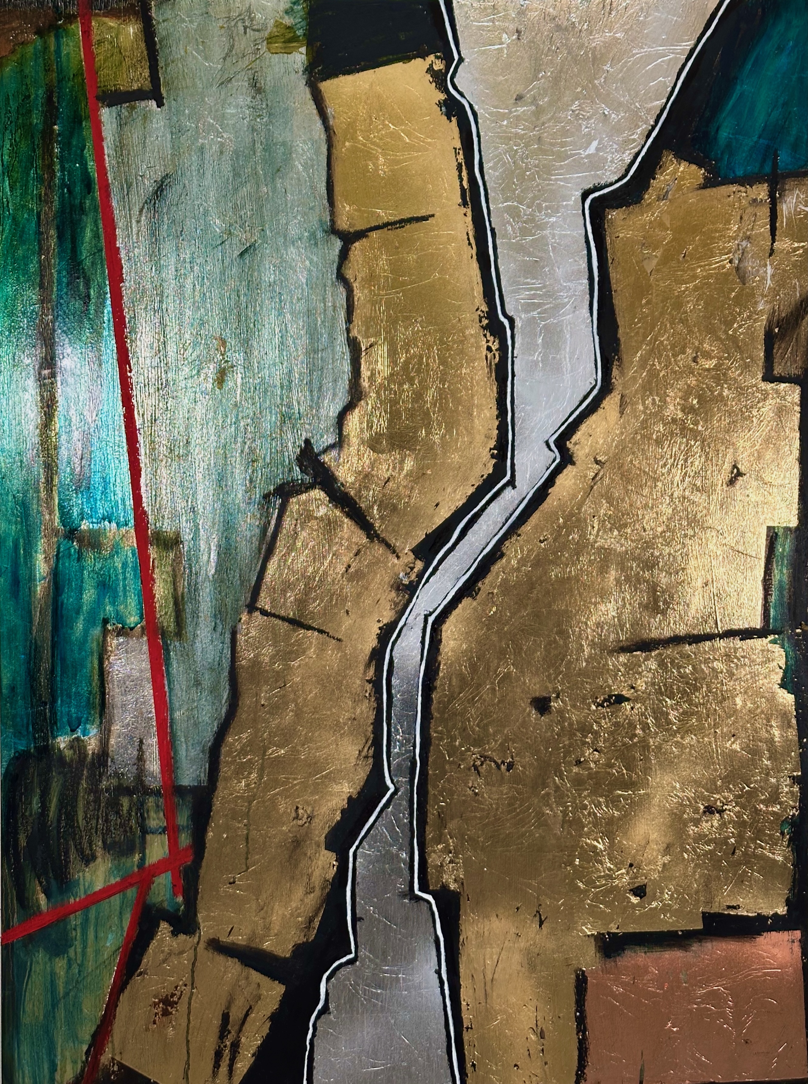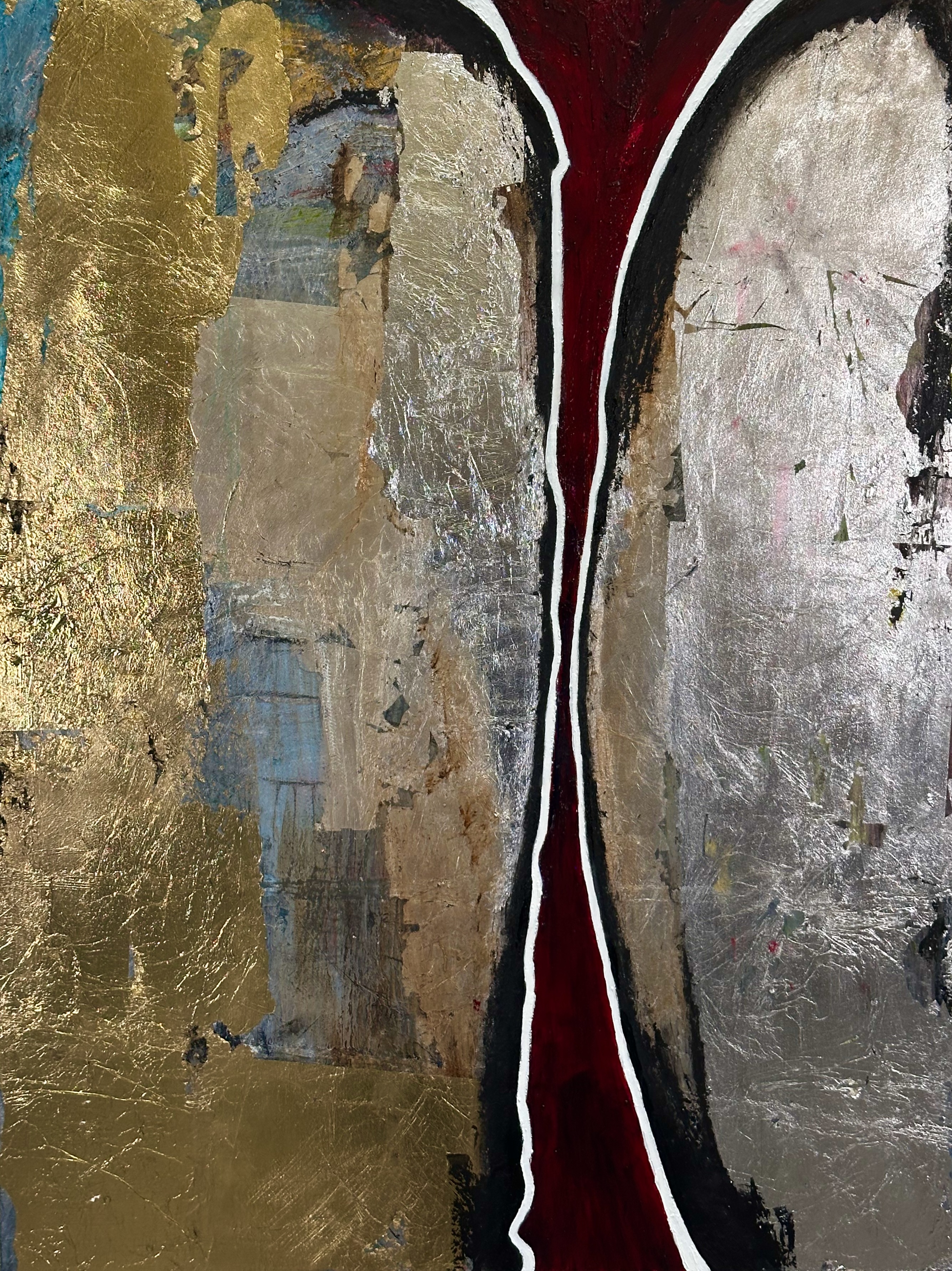 These days it would usually be a large thick black oil stick 🙂 I will have a general idea of the main composition element. Such as showing the space in-between two large composition blocks. And usually this will not be neatly aligned as I want to show activity, resistance and motion. For example in my work “Between the lines”, I wanted to show what it felt like to be a silent witness to an opposing/dominant force. The individual is the center of the piece (a beautiful ultramarine blue and alizarin red) surrounded by a larger active metallic texture (the dominant part). The individual is defined first using the black oil stick, then surrounding elements are laid down using metal leaf.